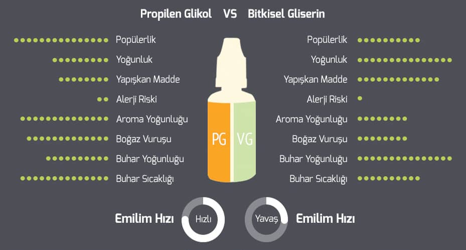Soldaki oran VG, sağdaki oran PG yi gösterir. Tavsiye olarak şunu söyleyelim, eğer sigara bırakma amacınız yoksa yüksek PG kullanımını düşük tutabilirsiniz. Pg oranı arttıkça boğaz vurumu da artacaktır. Bu da keyif için likit kullanımında öksürme yapabilir.
